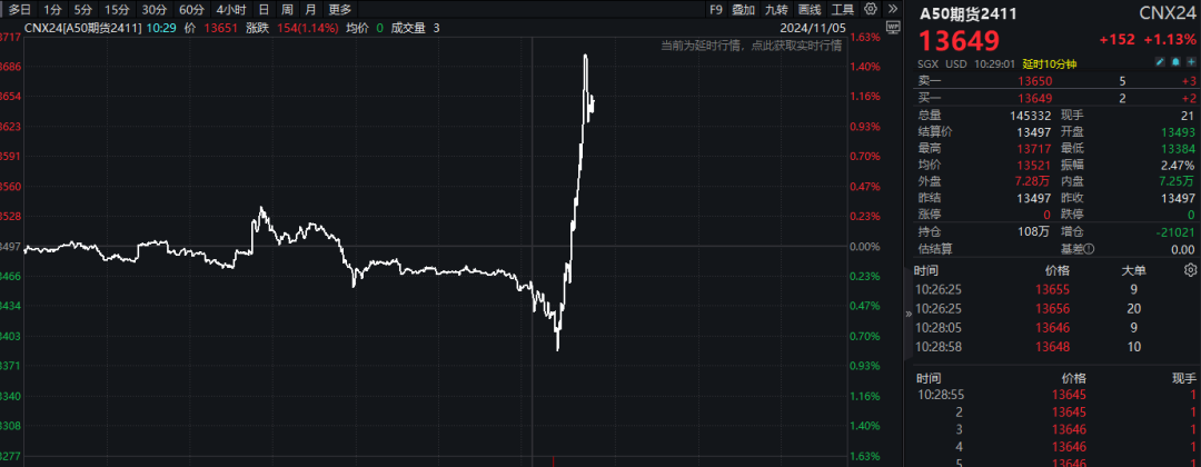 新加坡交易的富时中国A50指数期货盘中也出现一波明显的拉升。